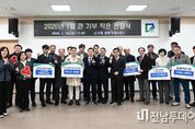 전남투데이 김경민 기자 | 병오년 연초부터 광주 남구청에 이웃사랑 실천을 위해 기부에 나서는 천사들의 발걸음이 줄을 잇고 있다. 20일 남구(구청장 김병내)에 따르면 새해 첫 번째 ‘큰 기부, 작은 전달식’이 지난 19일 오전 구청 6층 중회의실에서 열렸다. 전달식에는 김병내 구청장을 비롯해 더선 요양병원과 (사)광역광역시 장애인권익협회, 방림동 무등산 센트럴파크 아파트 입주자 대표회의, 입석 로터리클럽, 한국우리밀농업협동조합, 구립 늘봄 어린이집 관계자 27명이 참석했다. 이날 구청에 접수된 현금 및 물품은 1,335만원 상당에 달한다. 더선 요양병원 김수영 이사장과 직원들은 십시일반으로 모은 447만원을 기부했으며, (사)광주광역시 장애인 권익협회 김선옥 회장 및 관계자도 마스크 5만장을 후원했다. 또 방림동 무등산 센트럴파크 아파트 입주자협의회 서동열 회장과 조봉태 감사도 현금 100만원을 쾌척했으며, 입석 로터리클럽 김한철 회장과 조상균 차기 회장 등도 300만원 상당의 전기 장판 18개 및 쌀 10㎏ 20포를 기부했다. 이와 함께 효천지구 중흥S클래스 리버티 아파트